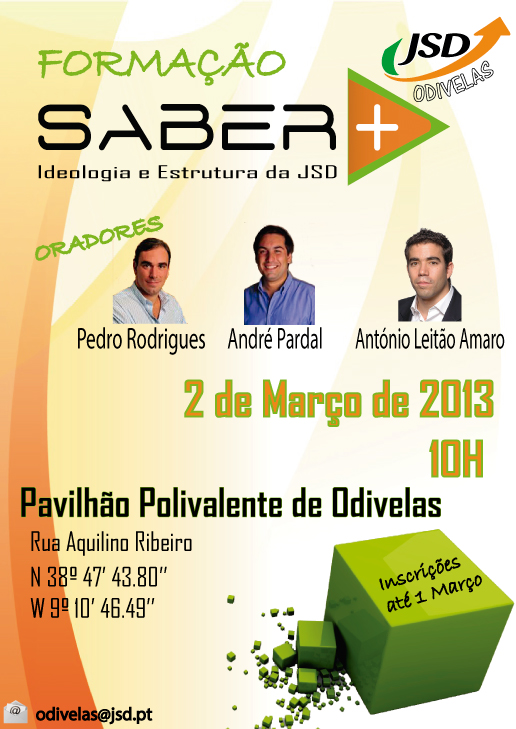 Como tem sido divulgado, a JSD Odivelas vai organizar uma formação saber+ no próximo Sábado, dia 2 de Março! Esta é uma das formações mais importantes e interessantes da JSD! Contaremos com excelentes ex-quadros da JSD para nos ajudar a entender melhor a nossa ideologia e estrutura!