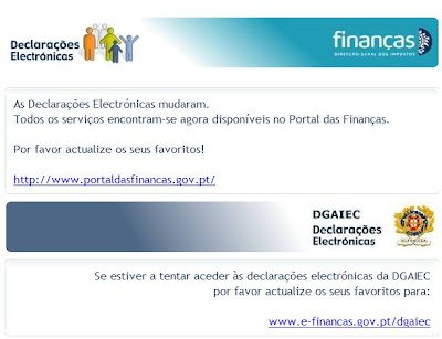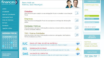 Agora, para consultarem a vossa situação fiscal, devem utilizar o endereço: http://www.portaldasfinancas.gov.pt/. Notamos que, desde o inicio deste mês este deverá ser o site onde podem, entre outras, entregar declarações de IRS, pagar o IUC, entregar o IMI ou o IMT. Assim, por exemplo, para o ano (Abril e Maio de 2010) deverão utilizar este endereço para entregar as declarações de IRS de 2009.